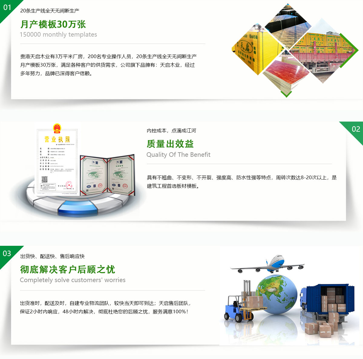 貴港市天啟木業位廣西貴港市覃塘區,是中國建筑模行業規(guī)模十大的企業之一,有著優(yōu)越地理位置,臨廣東,貴州,湖南,云南、交通運輸區位十分優(yōu)勢。現有職工近300人,占地50余畝,其中建筑面積近3萬平方米。日產量2萬張,年產量500萬余張;公司正在逐步壯大,旗下有4家分公司,總年產量近1500萬張!天啟木業引進芬蘭制膠技術,采用先進生產工藝。公司生產的建筑膜板采用優(yōu)質的防水膠制作,循環(huán)使用次數多,品質在同行業內認可度極高。是一家集產品研發(fā),生產,銷售,服務于一體的綜合型大型民營企業。產品覆蓋全國20多個省,市,自治區。